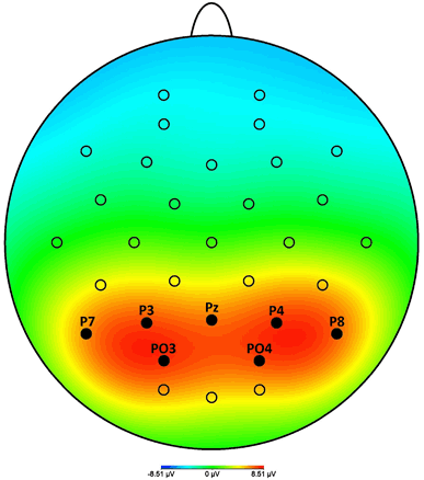 The time epoch and electrode cluster used for pooling oscillatory activity were based upon both previous findings and visual inspection of the data. The LPP has been shown to be maximal at posterior sites, and a head view image averaging all conditions indeed showed that for the present data, activity was strongest at the Pz, P3, P4, P7, P8, PO3, and PO4 electrodes (see Fig. 1). Therefore, the amplitudes of these electrodes were averaged. A time epoch of 400–800 ms was used across all analyses.
