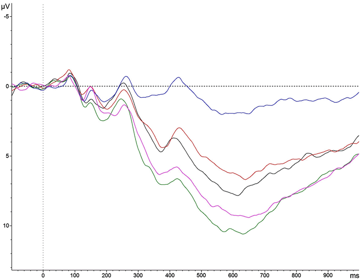 The ERP waveforms at the Pz electrode for the view-neutral condition (blue), the view-pleasant condition (black), the view-unpleasant condition (red), the ER-pleasant condition (green), and the ER-unpleasant condition (purple). (Color figure online)