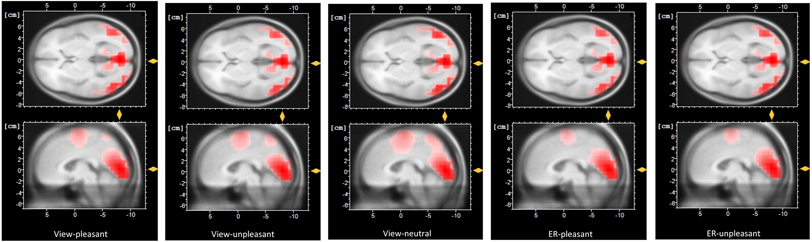 Averaged tomography (400–800 ms) in response to the view-pleasant, view-unpleasant, view-neutral, ER-pleasant, and ER-unpleasant condition