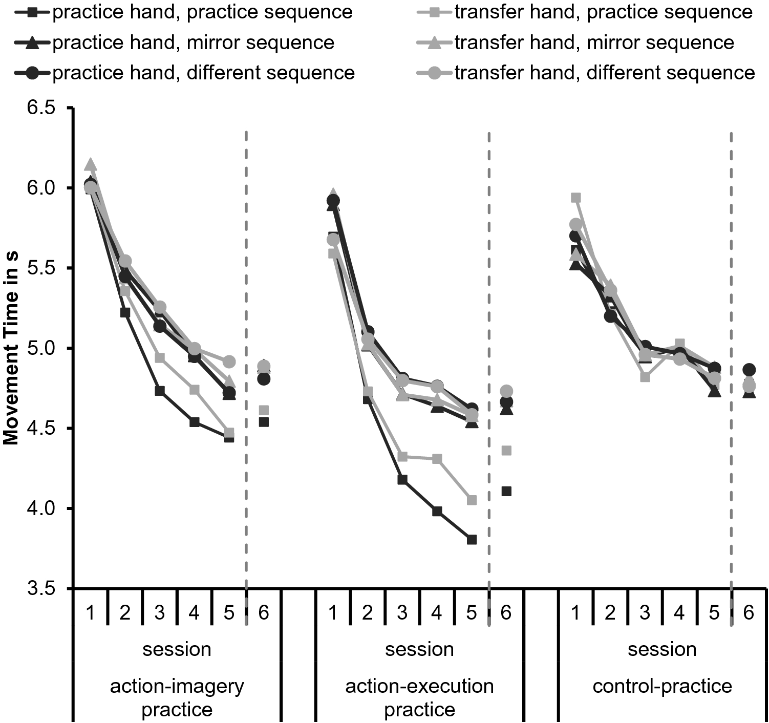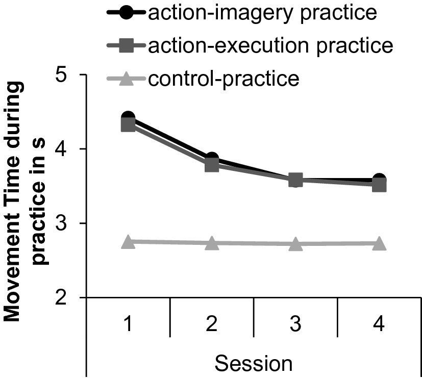 Note. The ANOVA was conducted with the factors practice group (action-imagery, action-execution, and control action), hand (practice, transfer), sequence (practice, mirror, different), and session (1, 2, 3, 4, 5, 6)