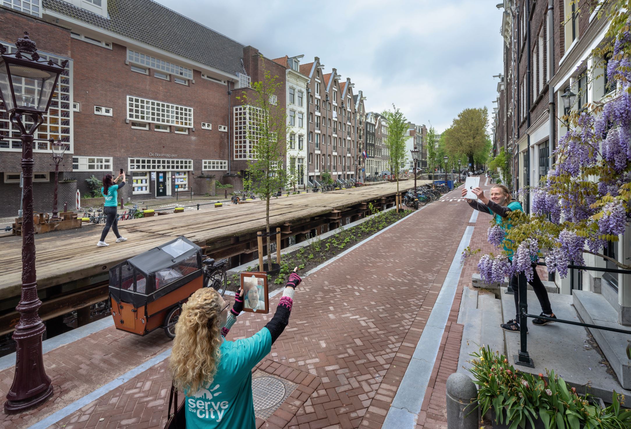Serve The City Amsterdam is een vrij- willigersorganisatie die oorspronkelijk alleen in de weekends leuke dingen organiseert voor kwetsbare mensen. Maar met de coronacrisis besloten de medewerkers ook op andere dagen in de benen te komen. Thijs Wolzak fotografeerde hen op de Rechtboomsloot in Amsterdam, waar de kadewal wordt gerestaureerd. Brigitte Vonck (rechts onder de blauwe regen) vertelt: 'We zijn hier aan het digitaal wandelen. Normaal doen we een rondje door de wijk met mensen die in een rolstoel zitten, maar die moeten nu thuis blijven. Dus doen we het digitaal met een iPad. We hebben contact tijdens de wandeling, dus zij kunnen aangeven welke kant we moeten opgaan.' Andere bezigheden van STC Amsterdam nu zijn: pannenkoeken bakken voor ouderen, lunches verzorgen voor zorgmedewerkers en pizza's bakken voor daklozen.