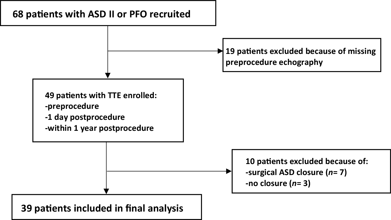 This retrospective study recruited adult patients (age > 18 years) who underwent transcatheter ASD/PFO closure with comprehensive echocardiographic datasets between 2013 and 2017 at the University Medical Centre Groningen, the Netherlands. Transcatheter ASD/PFO closure was indicated following the guidelines of the European Society of Cardiology (ESC) and the Netherlands Society of Cardiology [9]. Among the 68 recruited patients 39 patients with transcatheter ASD/PFO closure were included in the present analyses after excluding 29 patients due to unavailability of baseline echocardiography (n = 19), surgical approach transition (n = 7) or technical reasons (n = 3). The study flow chart is presented in Fig. 1. Of the 39 patients, 28 had a large ASD, and 11 had an ASD < 1 cm or a PFO, both with cryptogenic strokes as indication for closure. This study was conducted in accordance with local and national laws and regulations regarding retrospective research on clinical data, as verified and confirmed by the institutional review board of the University Medical Centre Groningen.