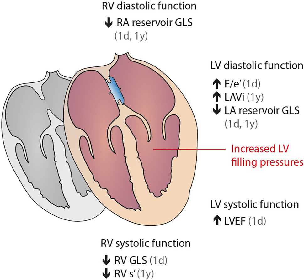 LVFP showed an early and sustained increase. Mean E/e’ ratio significantly increased from 6.3 ±2.0 cm/s at baseline to 7.3 ± 3.2 at 1 day (p = 0.003), and LA volume index significantly increased from 29.6 ± 12.4 mL/m2 at baseline to 34.5 ± 13.9 mL/m2 at 1 year (p = 0.04). LA reservoir GLS significantly decreased from 32.8 ± 13.9% at baseline to 26.7 ± 9.9% at 1 day (p = 0.006) and to 26.7 ± 10.7% at 1 year (p = 0.01).