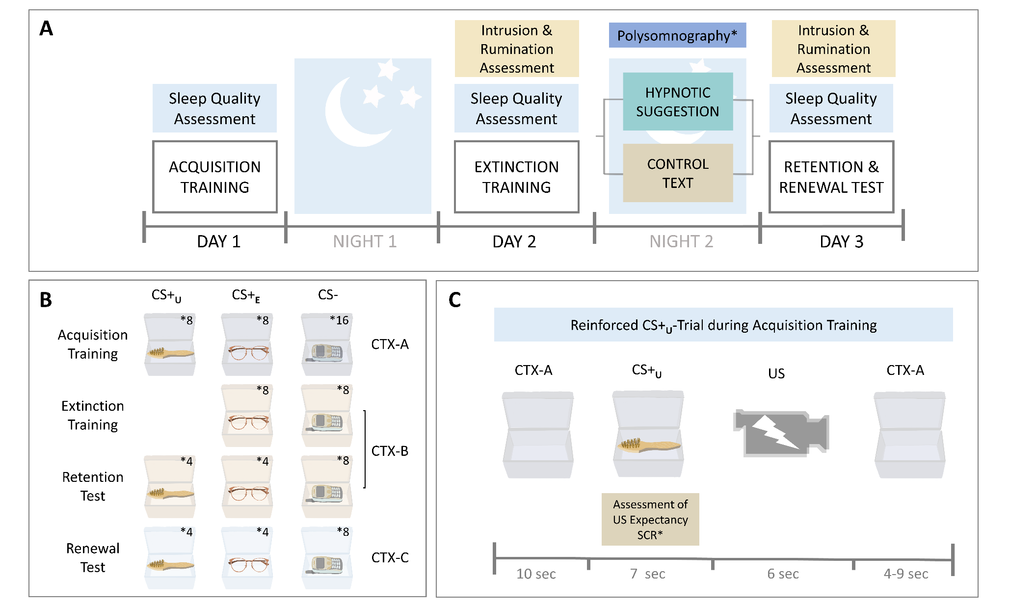 Based on these findings, the current study sought out to investigate the impact of sleep-directed hypnosis on subsequent sleep quality as well as retention and generalization of extinction. Healthy participants were subjected to a trauma-adapted fear conditioning paradigm, resulting in the acquisition of a conditioned fear response to neutral stimuli that predicted the occurrence of a traumatic film clip. After extinction training, participants were either subjected to sleep-directed hypnosis or a control condition prior to a full night of sleep. On the following day, participants completed an extinction retention and fear renewal test for previously extinguished and unextinguished conditioned stimuli. Sleep quality, intrusive memories, and rumination were assessed repeatedly throughout the experiment. We predicted to find higher SWS duration and sleep quality following sleep-directed hypnosis as compared to the control condition. Moreover, we expected that participants receiving sleep-directed hypnosis would show stronger retention and generalization of extinction. Finally, we expected that these effects would transfer to intrusive memories and ruminative thoughts such that participants would report fewer intrusive memories and ruminative thoughts about the traumatic clip after sleep-directed hypnosis.