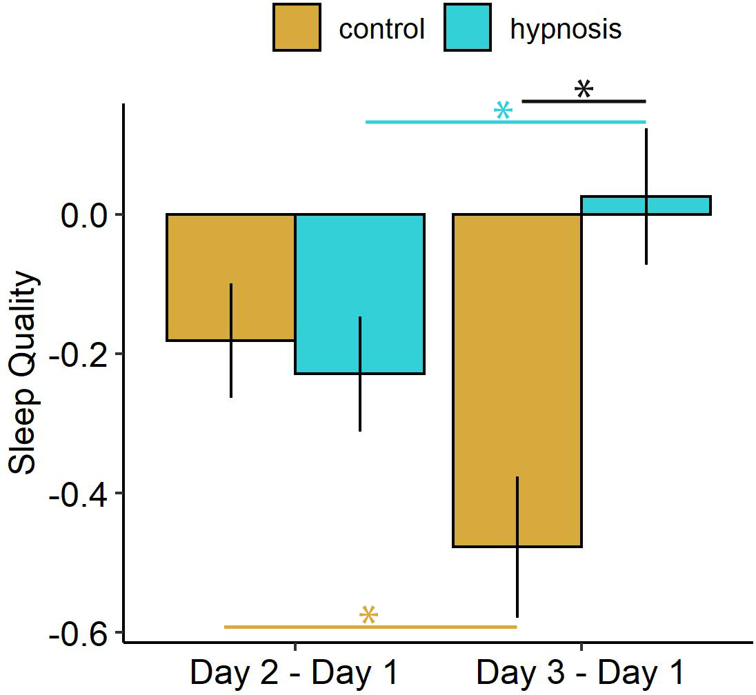 Our finding that sleep-directed hypnosis improves subjective sleep quality aligns with previous findings from Cordi et al. (2020) and extends these in important ways: First of all, we were able to show that this enhancing effect is also evident when sleep-directed hypnosis and subsequent sleep take place under ecologically valid conditions, i.e., in the participants’ home. Secondly, we were able to demonstrate convergent effects in and across two subsamples with high statistical power. Finally, we found this effect in the context of exposure to a traumatic film clip that may have affected sleep quality beforehand. That is, both groups showed a decline in sleep quality following acquisition training, suggesting a detrimental impact of the traumatic film clip on sleep (see also Richardson et al., 2015; Sopp et al., 2019; Talamini et al., 2013). This effect dissipated after the hypnosis intervention but not after control condition, indicating that sleep-directed hypnosis may have counteracted the effect of exposure to the aversive material on sleep quality. These findings suggest that the effects of sleep-directed hypnosis may also emerge in the context of trauma and other distressing life events, forming an important basis for the application of sleep-directed hypnosis in clinical settings.