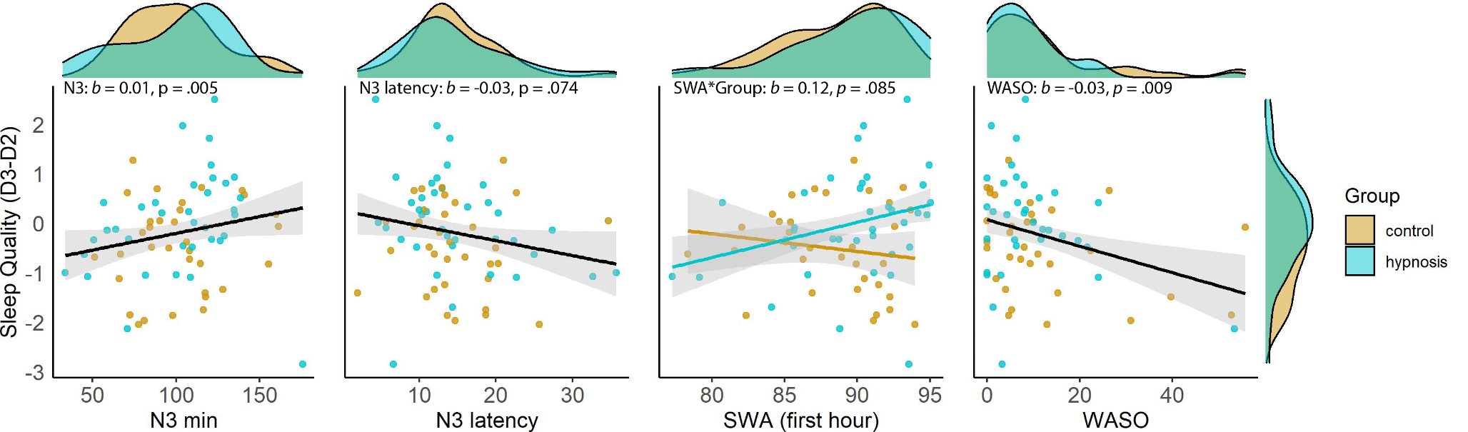 Relationship between subjective sleep quality and objective sleep parameters of the sleep period in Night 2 in the laboratory subsample. Note. Density plots showing the distribution of sleep variables in the control and hypnosis group. Scatter plots illustrating the linear relationships between the change in sleep quality from Day 2 to Day 3 (difference scores) and PSG-based sleep variables across/within the experimental groups. Note that the scatterplots present raw data, whereas the linear slopes were build on robust regression modeling. N3 = non-rapid eye movement sleep stage 3, SWA = slow wave activity, WASO = wake after sleep onset
