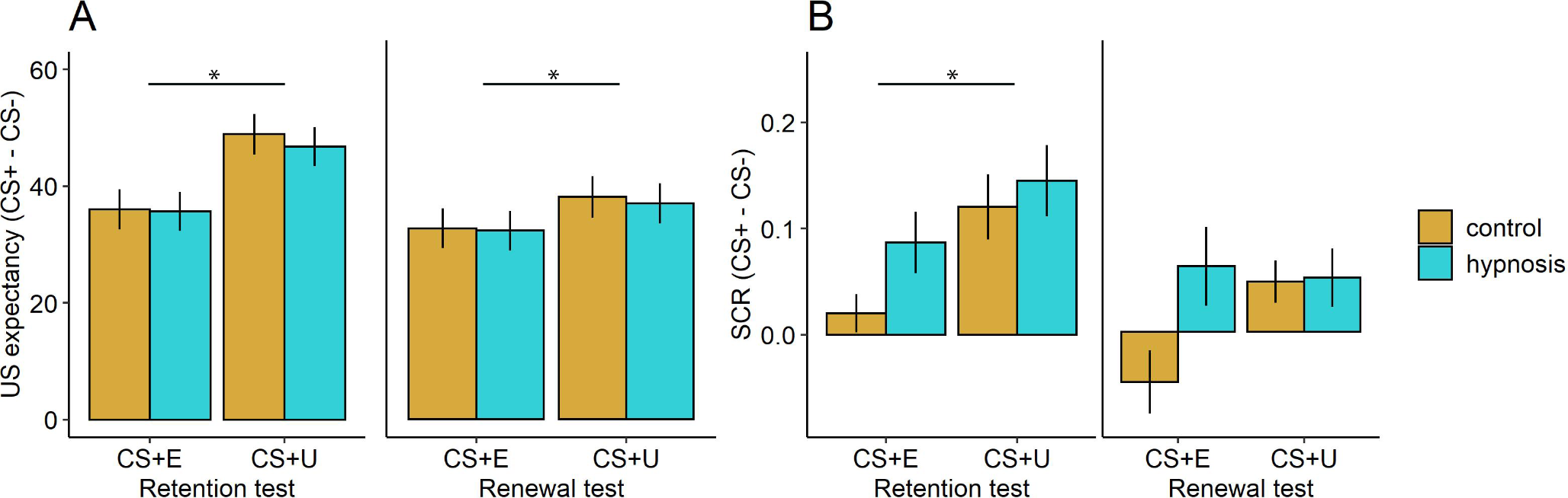 Fear expressions during retention test and renewal test. Note. Means and standard errors of differential US expectancy scores (4A) and skin conductance responses (SCR in microSiemens, square-root transformed; 4B) in the laboratory subsample averaged across the respective test phase. Asterisks indicate significant main effects of CS + type based on linear mixed-effects model (LMM) analyses (*p < .05). No effects of Group were found in any analysis. Note that means and standard errors do not represent all components of the LMMs that were built by the data; plots are shown for illustration.