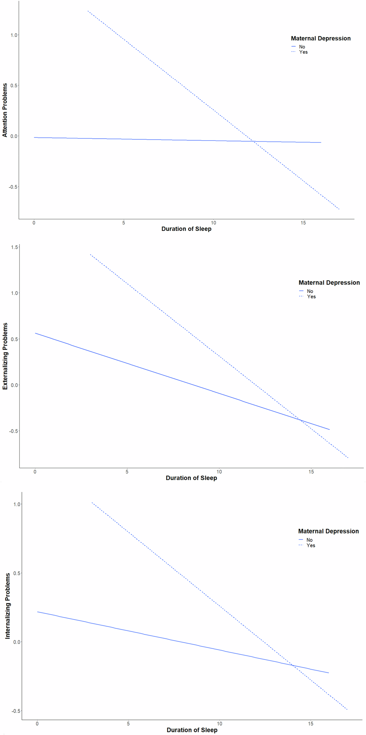 In our moderated regression analyses, we specifically investigated the interaction between sleep duration and maternal depression on various child behavior problems (attentional, externalizing, and internalizing), while controlling for household income, maternal relationship status, and maternal age.