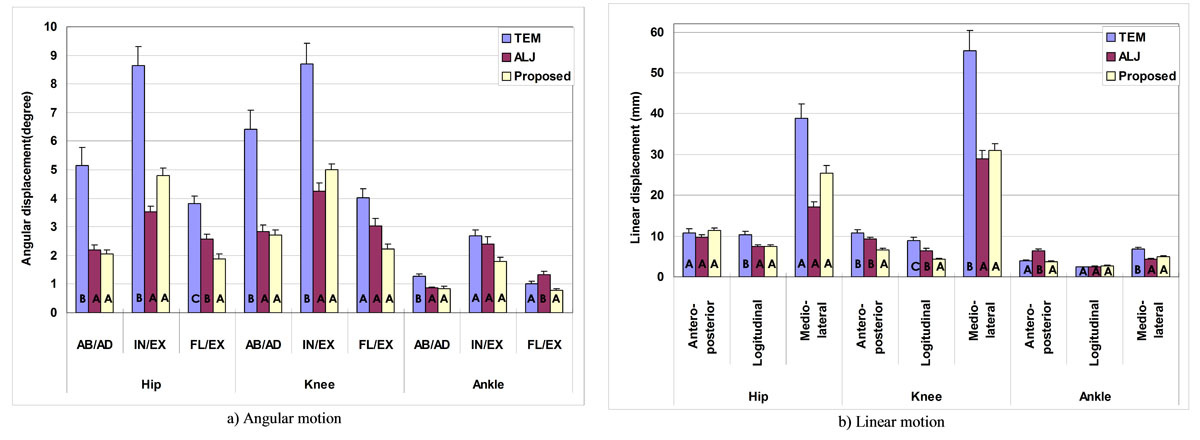 Soft tissue artifact (STA), the deformation of skin and muscle during motion, is known to be one of the important sources of errors in human motion analysis using stereophotogrammetry. As a way to reduce the STA errors, methods estimating positions of anatomical landmarks (AL) have been proposed that keep them rigidly related to the underlying bone. The previous methods [1, 2] used intermediate variables such as joint angles or motion time to adjust AL positions which were calculated from position data of skin markers. The present study proposes a method to estimate AL positions with skin marker positions directly, thereby removing the intermediate variables of the previous methods. The proposed method identifies a systematic relationship between the displacements of ALs and skin markers relative to a technical coordinate frame defined by skin markers in ad hoc motions(Figure 1). Then, AL positions are calibrated directly by using the displacement relationship with skin markers. The proposed method was applied to analyze three lower extremity motions (walking, sit-to-stand/stand-to-sit and step up/down) of ten healthy males. Its performance was compared with the transformation error minimization method (TEM) of [3] and the AL estimation method with joint angle (ALJ) of [2]. The proposed method considerably reduced STA errors relative to the TEM (by 30 – 80% ) and was also slightly more effective than the ALJ, showing 25 – 40% error reductions for seven of 18 kinematic variables(Figure 2).