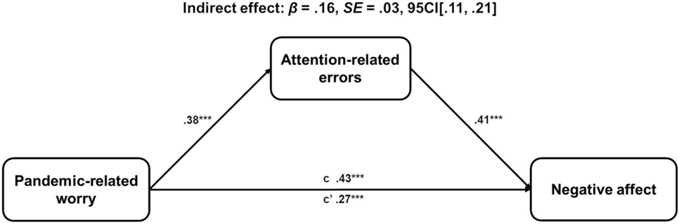 A five-factor model of PRW was identified, with factors reflecting worry about decline in quality of life (QoL) and probability of infection correlating with attention and memory-related errors. Importantly, attention-related errors partially mediated the positive relationship between PRW and negative affect, even when controlling for pre-pandemic trait anxiety.