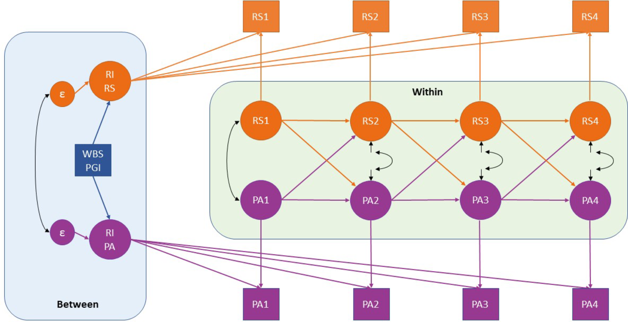Theoretical Random Intercept Cross-Lagged Panel Model with Two Variables. WBS PGI: Wellbeing spectrum polygenic index; RI: Random Intercept; RS: Relationship Satisfaction; PA: Positive Affect. Numbers indicate the different timepoints (1 to 4). “Between” indicates the “between-person” processes (also referred as “time-invariant stability”), whereas “within” indicates “within-person” processes, composed of stability (auto-regressive paths) and change (cross-lagged paths)