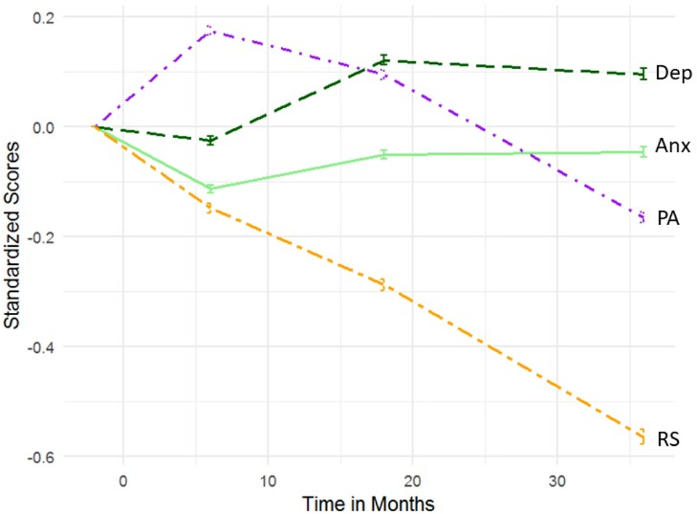 Standardized Averages and Trajectories. Standardized scores with 95% confidence intervals. Time counted in months, where 0 represents time of delivery. RS: Relationship Satisfaction; PA: Positive Affect; Dep: Depressive symptoms; Anx: Anxiety Symptoms