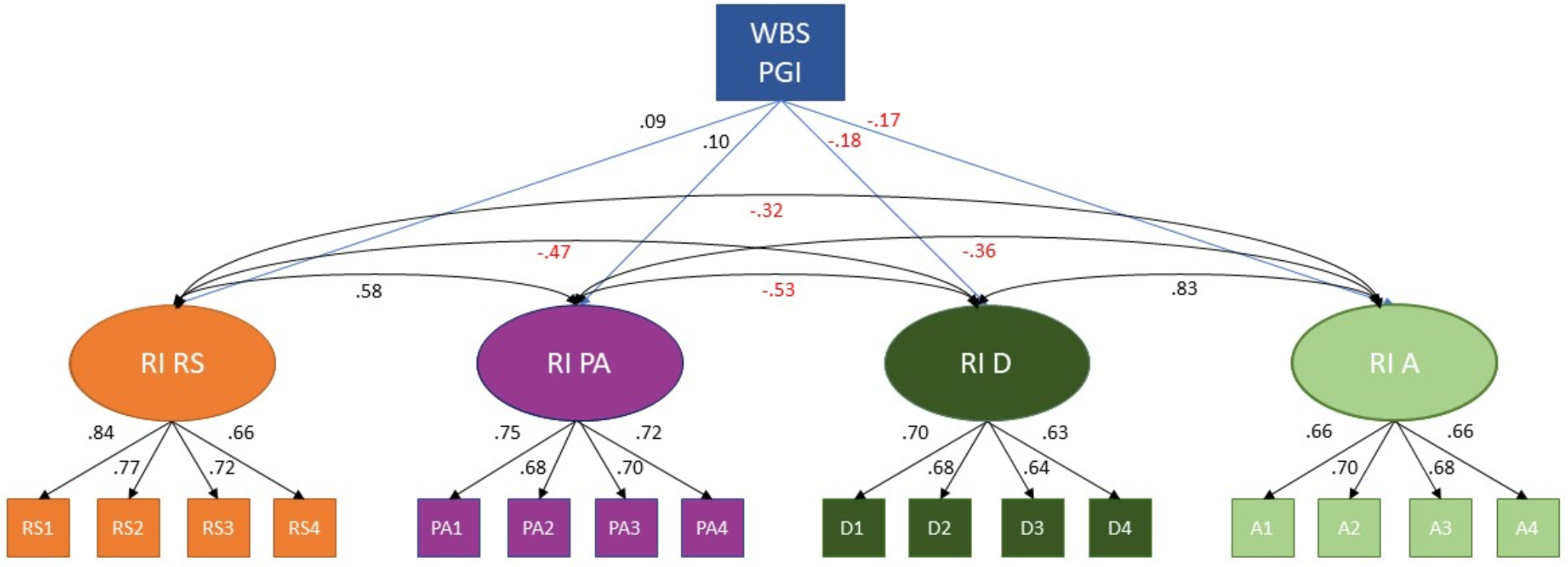 Time-invariant Stability of the Constructs (Between-Person Processes). WBS PGI: Wellbeing spectrum polygenic index; RI: Random Intercept; RS: Relationship Satisfaction; PA: Positive Affect; D: Depressive; A: Anxiety. Numbers indicate the different timepoints (1 to 4). All coefficients are standardized and have p < 0.001