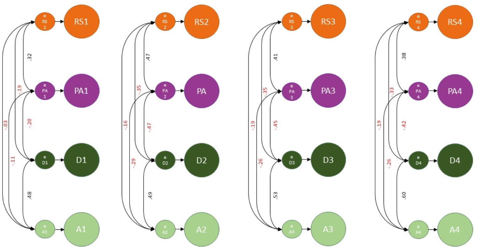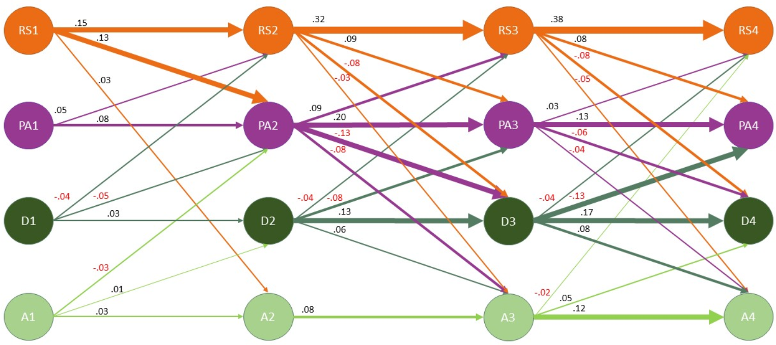 Stability and Change in the Constructs (Within-Person Processes). All coefficients shown are standardized and significant (p < 0.001). Nonsignificant coefficients were excluded from the figure to improve readability. The width of the arrows is proportional to the coefficient size. RS = Relationship satisfaction; PA = Positive affect; D = Depressive; A = Anxiety. Numbers represent the different timepoints (1 to 4)