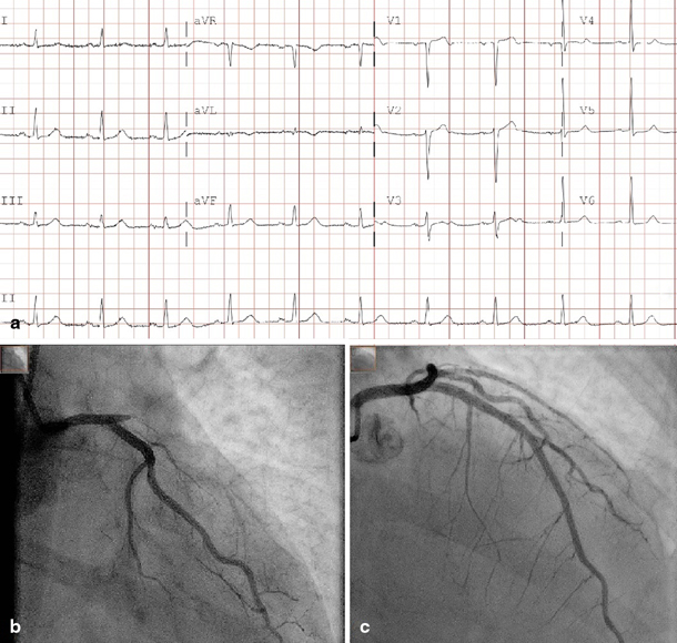 a Electrocardiogram on admission. 25 mm/s, 10 mm/mV. b Left coronary artery in RAO caudal angulation. Before intervention. c Left anterior descending artery in RAO cranial view. After PCI with implantation of a 3.5 mm drug-eluting stent