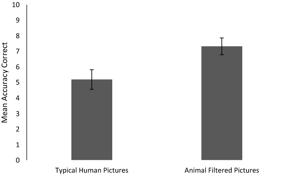 The ten pictures that made up the Original Human emotion set were unaltered from the original KDEF test. For the Animal Filter set, these same ten pictures were put through an animal filter process (retrieved from http://funny.pho.to/human-to-animal-montages/). All female faces were presented in a lion filter, and male faces in a gorilla filter. There were color differences between the human and animal faces, specifically, the animal filters recolored the faces to fit the respective animal theme. However, research suggests that these lower level perceptual differences do not affect emotion recognition (Calvo and Nummenmaa 2011). Importantly, the animal images did not change the inner aspects of the face (aka eye size, mouth positioning), meaning that this filter did not affect higher level face elements that could explain any performance differences. This means that the differences between animal and human faces used in the study are not simply a product of increasing the salience of the high level aspects of the face (aka the eyes) but are instead a factor of the context in which the face/emotion is presented.