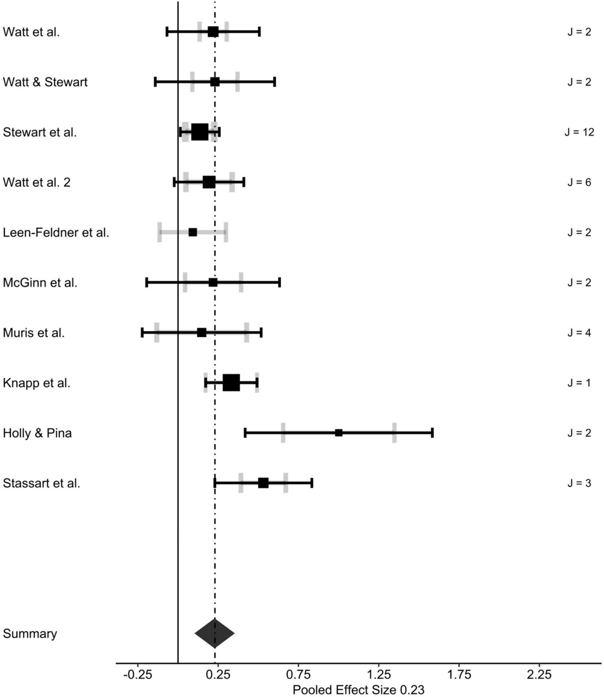 The remaining five included studies used Child Anxiety Sensitivity Index (CASI; Muris, 2002; Silverman et al., 1991) to assess fear of anxiety-related symptoms in children and adolescents. The CASI has also demonstrated strong psychometric properties, including internal consistency, criterion, concurrent, and discriminant validity (Kearney et al., 1997; McLaughlin et al., 2007; Muris et al., 2001; Rabian et al., 1999). Some previous studies have found multidimensional factor structure for CASI (Adornetto et al., 2008; Bernstein & Zvolensky, 2007; Essau et al., 2010; Lambert et al., 2004; Muris et al., 2001; Silverman et al., 2003; Weems et al., 2002, 2010), however, in the present review, studies have only relied on reporting of the overall CASI score (see “Appendix D,” studies 6–10).