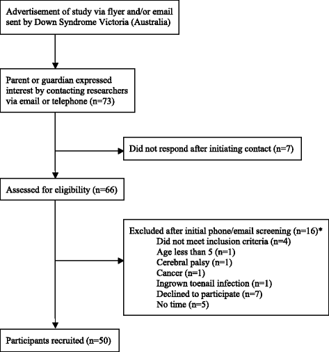Children and adolescents with all genetic variants of DS aged five to 18 years were invited to participate in this study through email advertisements and flyers distributed to members of Down Syndrome Victoria. Participants were excluded if they had any previous lower limb surgery, were unable to walk without a supportive device such as a walker or brace, or had a concomitant medical condition or injury that could affect their physical function (e.g. neurological or inflammatory disorder). Fifty children and adolescents with DS aged five to 18 years were recruited. The participant recruitment process is shown in Figure 1.