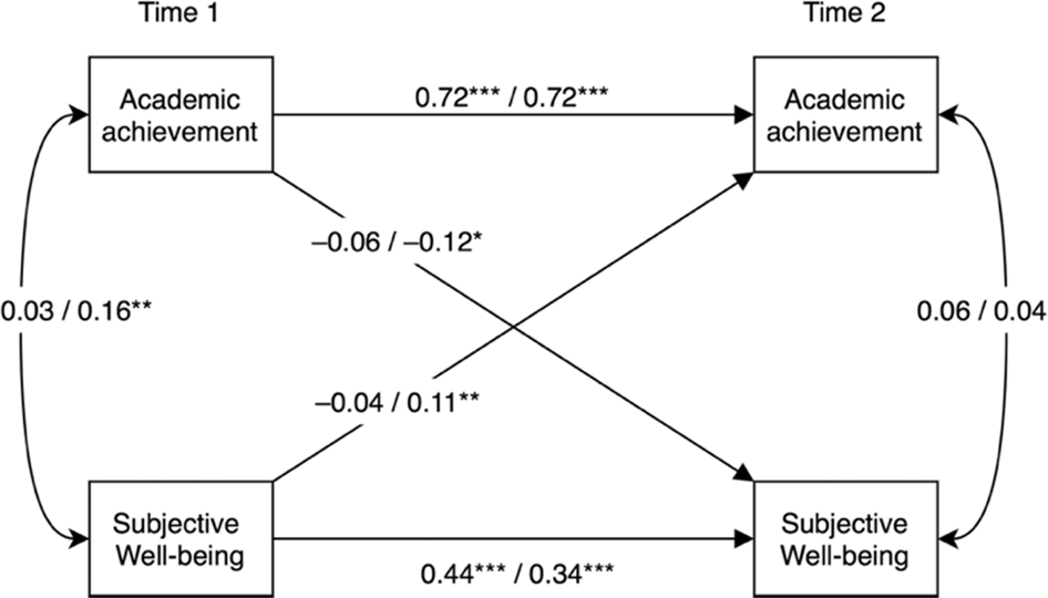 Estimated cross-lagged path model relating academic achievement and subjective well-being (boys n = 371, girls n = 352). Estimates (standardized) are displayed as “boys”/“girls”. For clarity, the control variables (immigrant background, family structure, parental education) and error terms have been omitted from the figure. *p < 0.05, **p < 0.01, ***p < 0.001