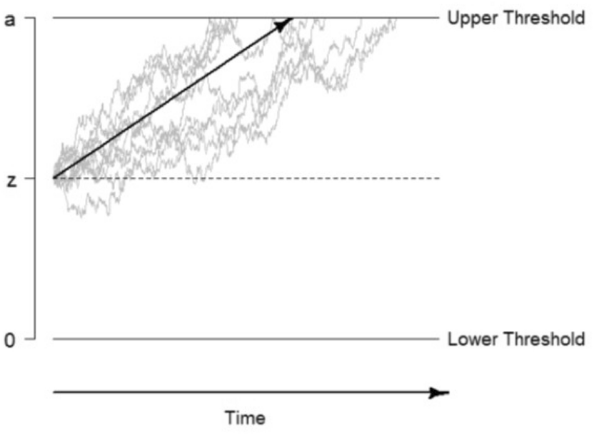Graphical illustration of the drift–diffusion mode. Note. The decision process begins at the starting point z. Over the time more and more information will be accumulated until one of both thresholds is reached. The drift parameter v represents the strength and direction of the evidence accumulation process (represented by the black arrow). The parameter a describes the distance between both thresholds. The figure does not display the non-decision time t0. Figure with permission from Frischkorn and Schubert (2018), licensed under CC BY
