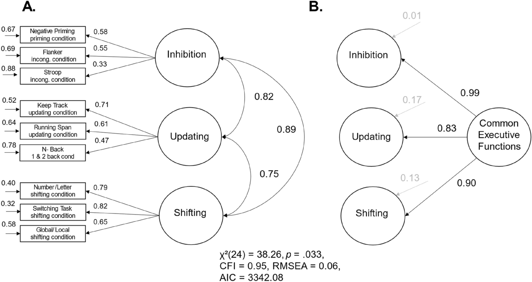 We used drift rates of the drift–diffusion model as homogenous measurement scores and structural equation models to separate task-general properties of drift rates from properties specific to executive functions. Our approach avoided the use of difference scores and their psychometric problems, thereby overcoming the two main issues of measuring executive functions—inconsistent use of RT- and accuracy-based scores and psychometric problems of difference scores. We found three latent factors of executive functions that loaded on one higher-level common executive functions factor. After introducing the higher-order factor, we observed no remaining variance specific to the three executive functions on the first-order latent level. We therefore specified a more parsimonious one-factorial solution, in which all tasks loaded on one latent first-order common executive functions factor. This model described the data only marginally worse than the more complex hierarchical model (∆ AIC = 7.60) and provided a good account of the data. In addition, given the absence of significant residual variances in the hierarchical model, the additional explanatory power of the more complex model seems highly questionable. In this context, the one-factor solution emerges as the more favorable model. However, future work should replicate our results with a larger sample size to get a better understanding of the nature of the common factor and the very small non-significant executive function specific variances as shown in Fig. 3B.