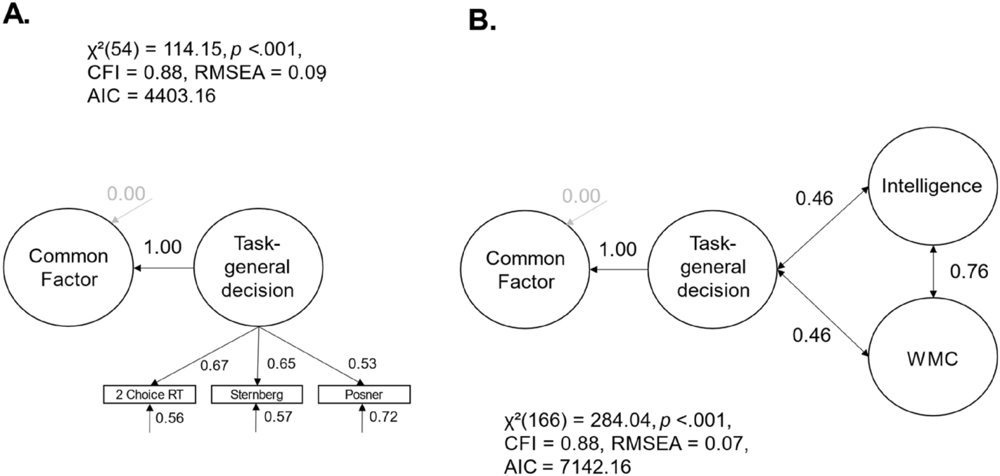 If we introduced a higher-order cognitive abilities factor in our model instead of intelligence and WMC separately, the correlation between higher-order cognitive abilities and task-general speed of information uptake was also high, r = .53, p < .001, 95% CI [.37, .69].