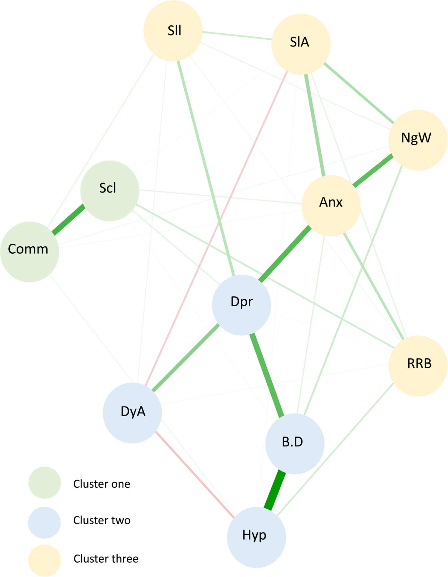 Network model of sleep problems, autism symptoms and emotional and behavioural difficulties. Note. The three clusters identified within the network model are reflected by numerical values ‘1, 2, 3’ and (cluster one = green; cluster two = blue; cluster three = yellow). Autism symptom label descriptions: Scl = Reciprocal social interactions; Cmm = Communication; RRBs = Restricted, repetitive & stereotypes patterns of behaviour. Sleep problem label descriptions: NgW = Night waking/parasomnias; SlA = Sleep anxiety/co-sleeping; Sll = Sleep initiation & duration; DyA = Daytime alertness. Emotional and behavioural difficulty label descriptions: B.D = Behavioural difficulties; Anx = Anxiety; Hyp = Hyperactivity; Dpr = Depression. Tie strength is indicated by line thickness between nodes with thicker lines representing stronger ties. The lines between each node represent either a positive correlation displayed as green or a negative correlation displayed as red