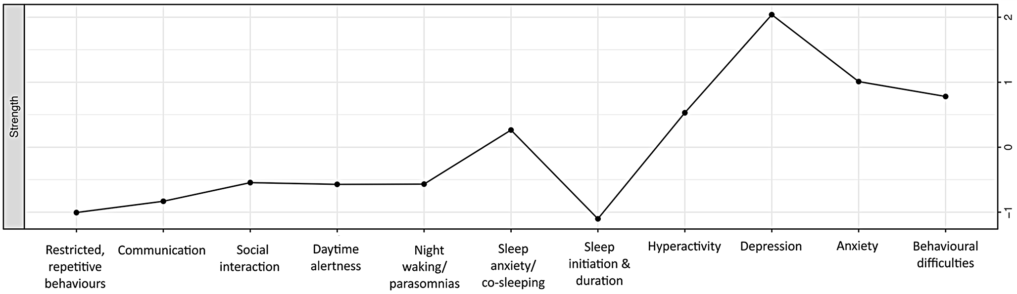 In addition to identifying clusters within the network model, we investigated which variables were most central to the network. Depression, anxiety, and behavioural difficulties emerged as most central, with the strongest connections to other variables, either through the number, and/or strength of connections. Specifically, depression was directly connected to six other variables in the network and maintained the strongest connection with behavioural difficulties, anxiety, and daytime alertness. Similarly, anxiety, was directly connected to seven other variables in the network, maintaining the strongest connections with depression, night waking/parasomnias and sleep anxiety/co-sleeping. Behavioural difficulties, while still connected to five other variables in the network, maintained a very strong connection with hyperactivity and depression.