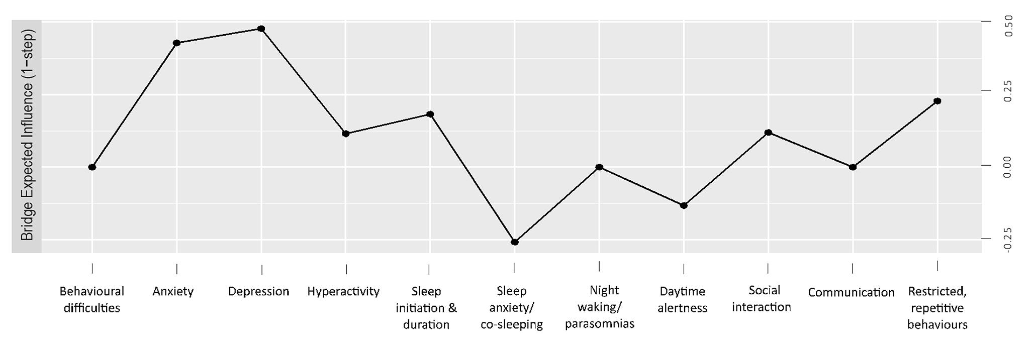 Bridging symptoms within the network are illustrated in Fig. 3 and depicted by bridge one-step expected influence (EI1) values. Depression, anxiety and RRBs had the highest bridge EI1, with connections both within and between clusters. Depression had strongest within-cluster connections to behavioural difficulties and daytime alertness in cluster two, and strongest between-cluster connections to anxiety and sleep initiation and duration (cluster three), and small connections to cluster one variables. Anxiety had the strongest within-cluster connections to night waking/parasomnias, sleep anxiety/co-sleeping and RRBs; and the strongest between-cluster connection to depression (cluster two), and small connections to cluster one variables. RRBs also demonstrated connections across all three clusters, with the strongest within-cluster connection to anxiety; and the strongest between-cluster connections with social interaction (cluster one), and hyperactivity (cluster two).