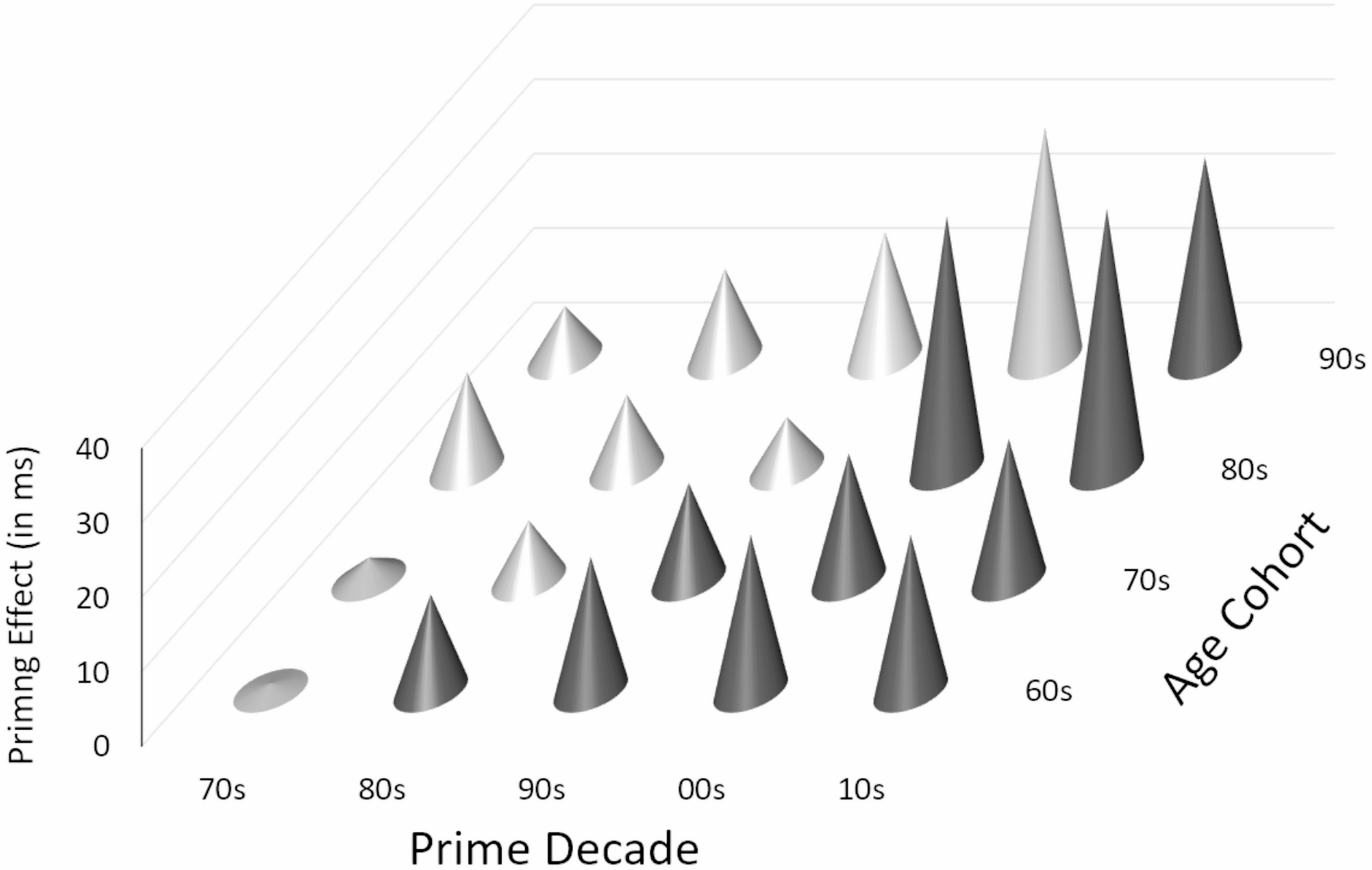 Priming Effects (Baseline 60 s Primes) for All Prime Decades (From the 70 s on) and Cohorts. Priming Effects were calculated by subtracting simple priming differences of each decade (beyond the 60 s) and each cohort from simple differences for the 60 s prime decade. We calculated simple priming differences by subtracting the mean RT for new-target trials from the mean RT for old-target trials. A positive value for Decade x in Cohort y means that, relative to a 60 s prime, the x primes relatively favored the “new” response. The light grey cones denote prime decades from before birth up to the age range 10-19 for the respective cohort, the dark grey cones denote prime decades thereafter