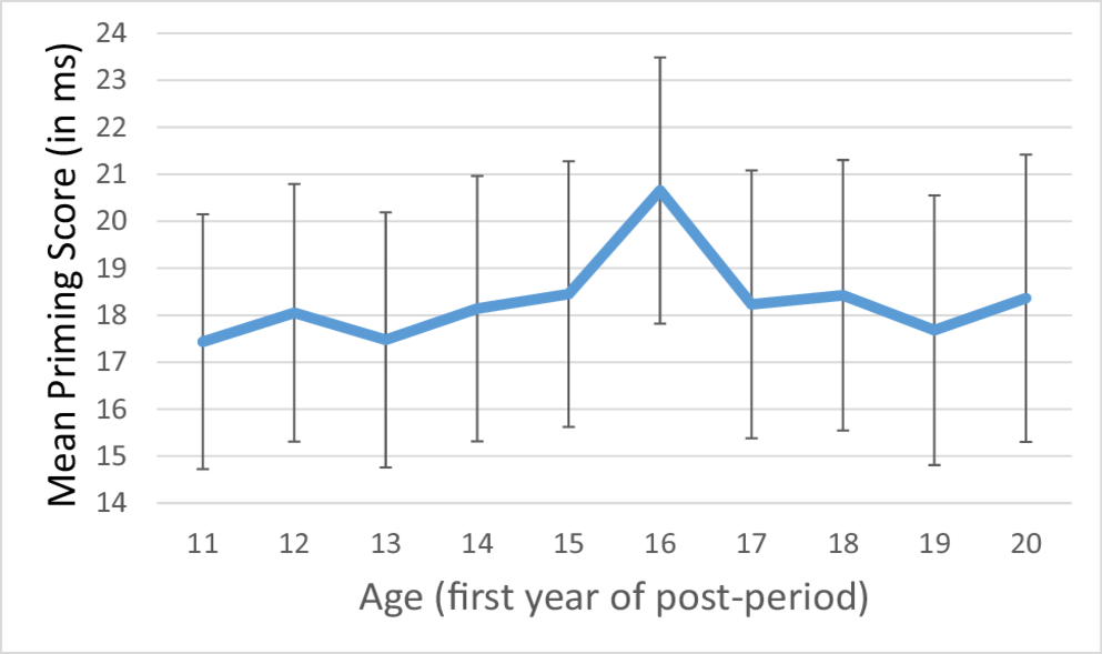 Individualized Priming Scores (in ms) for a Range of Cut-Off Years (First Year of the Postperiod +/−1 SE). For each participant, we calculated an age-dependent priming effect by (a) aggregating simple priming differences (i.e., mean RTold−target trials - mean RTnew−target trials) for movies from the early years, including the year in which the participant turned x (“preperiod”) and (b) aggregating simple differences for prime movie for all years from when participants were x + 1 or older (“postperiod”), and finally subtracting the preperiod aggregate from the postperiod aggregate to obtain a priming score. The Figure shows the priming scores for cut-off values x from 11 to 20 years.