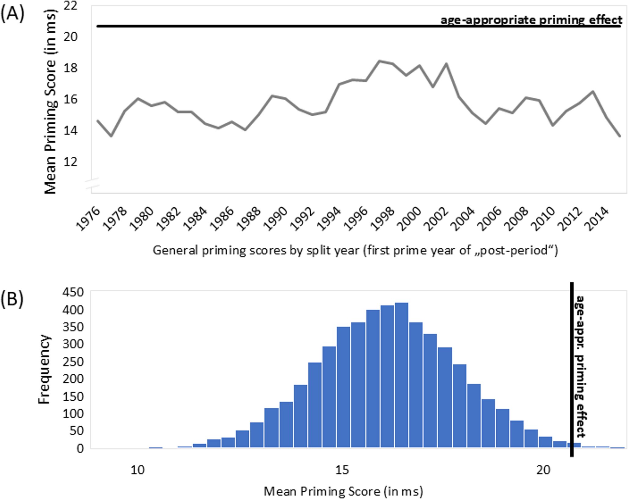 The Age-Appropriate Priming Score (Based on Participants’ Individual Age, cut-off 16 years; Black Lines) in Relation to (A) General Scores for All Participants as a Function of Split Year (Grey Line) and (B) the Distribution of Bootstrapped Mean Priming Scores