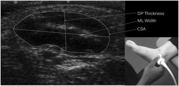 All ultrasound scans and interpretation were performed by a single researcher who underwent four months of training in musculoskeletal ultrasound prior to data collection. The researcher demonstrated high intra-tester reliability for measuring dorso-plantar thickness (ICC3,1 0.91), medio-lateral width (ICC3,1 0.85), cross-sectional area (ICC3,1 0.92) and echo-intensity (ICC3,1 0.93).
