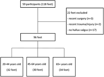 Demographic and clinical data was obtained from all participants including gender, age, ethnicity, weight and height. In addition, the severity of hallux valgus on each foot was graded using the Manchester Scale [19]. Feet were graded as 0 ‘no deformity’, 1 ‘mild deformity’, 2 ‘moderate deformity’ and 3 ‘severe deformity’. Feet without hallux valgus (i.e. grade 0) were excluded from the analysis. Selective sampling was employed to ensure an equal number of feet in each of the three age groups which were determined by the participant’s age: 20–44 years old, 45–64 years old, and 65+ years old.