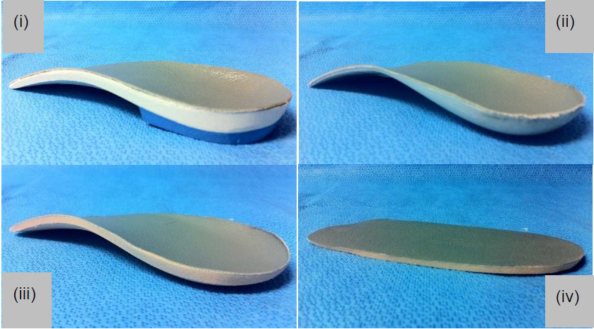 Posterior-medial view of the (i) customised foot orthosis, (ii) contoured polyethylene sham foot orthosis, (iii) contoured EVA sham foot orthosis, and (iv) flat EVA sham foot orthosis.