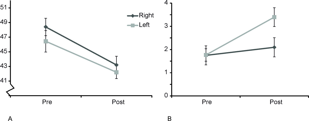 The FPI-6 scores [Rasch logit values] significantly increased following the half marathon (TIME F (1,29) = 15.9 p < 0.001). There was a significant time x side interaction (TIME X SIDE F (1,29) = 15.1 p < 0.001). The interaction indicates that following the half marathon the FPI-6 scores increased significantly more on the left [+ 1.7] and although the right side changed too [+ 0.3] this was not statistically significant (Figure 1B).