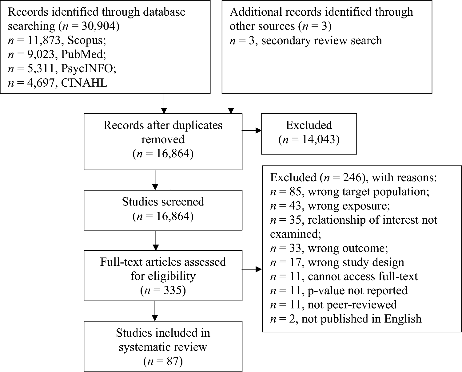 The screening process is shown in Fig. 1. The primary database searches yielded a total of 30,904 articles. Three additional records were identified through a search of existing reviews. After removing duplicate articles (n = 14,043), 16,864 studies were screened by title and abstract. A total of 16,529 articles were considered irrelevant and therefore excluded. As a result, 335 studies were considered for full-text review and assessed for eligibility. A final total of 87 studies were included in this systematic review.