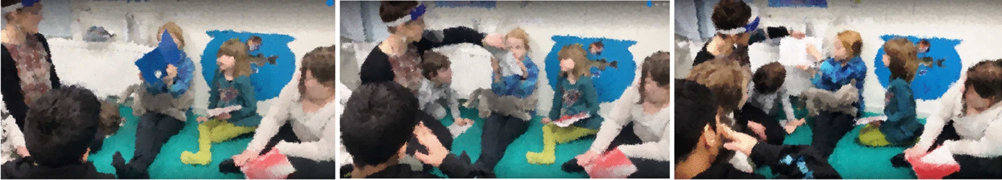 In a slightly different manner, In excerpt 4—Establishing the dynamic of the presentation, child 2 explains (line 13) his desired way of participating after the teacher proposes a different way of participating (line 1). The child anticipates the rules of the group dynamic and positions himself as the ‘one ahead of the process of sharing’, conducting the presentation. In this interaction, it is important to highlight how the teacher accepts the child’s explanation and flexibly follows the child’s proposal for the presentation (shown in line 27). To illustrate the dialogue and the embodied actions that support this interpretation, we present excerpt 4 and Fig. 6.
