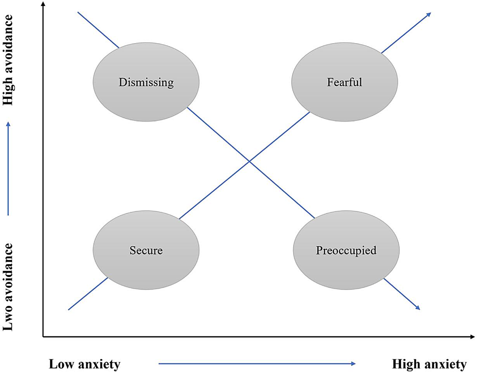 In terms of different attachment styles, Bartholomew and Horowitz’s (1991) four-category model has received considerable attention. More specifically, this model is based on the interplay between two attachment dimensions of anxiety and avoidance, with reference to the internal working models of self and others. High/low anxiety indicates negative or positive views of self, whereas high/low avoidance reflects negative or positive attitudes toward others. Therefore, this model yields four categories of attachment styles based on natural configurations of high/low anxiety and high/low avoidance: (a) secure (low anxiety and low avoidance), (b) preoccupied (high anxiety and low avoidance), (c) dismissing (low anxiety and high avoidance), and (d) fearful (also known as disorganized; high anxiety and high avoidance).