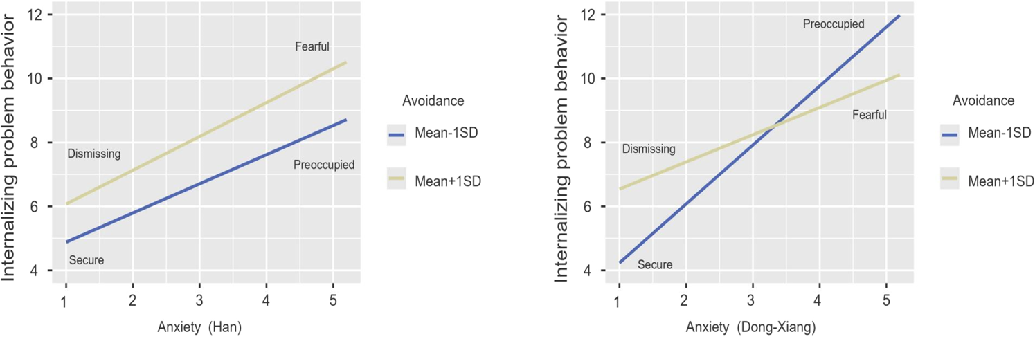 Through the comparison of the interaction patterns between these two ethnic groups, we concluded that, in the presence of lower anxiety, both Han and Dong-Xiang adolescents with higher avoidance (“dismissing”) tended to report higher internalizing problem behavior than those with lower avoidance (“secure”). However, different interaction patterns were exhibited in the presence of higher anxiety. Adolescents with fearful attachment style reported the highest levels of internalizing problem behavior among the Han, whereas Dong-Xiang adolescents with lower avoidance (“preoccupied”) attachment style did so.
