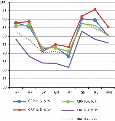 Both Harris et al. [33] and Cho et al. [31] used well-characterized study populations, allowing them to adjust for a number of relevant factors, similar to our approach. In all three studies, the relations remained after the adjustments, implying that there seems to be a biological link between low-grade inflammation and HRQoL. In particular, although the studies use in part different methods and biomarker levels, both Harris et al. [33] and Cho et al. [31] indicate that neither CRP nor IL-6 alone is a sufficient measure and that a combined measure of the two is superior. Our data confirm that subclinical elevation in only one of these two biomarkers may be cumbersome to evaluate as there are small differences in comparison with the group without any elevation, whereas an elevation in both may be a better marker for sustained elevations in low-grade inflammation.