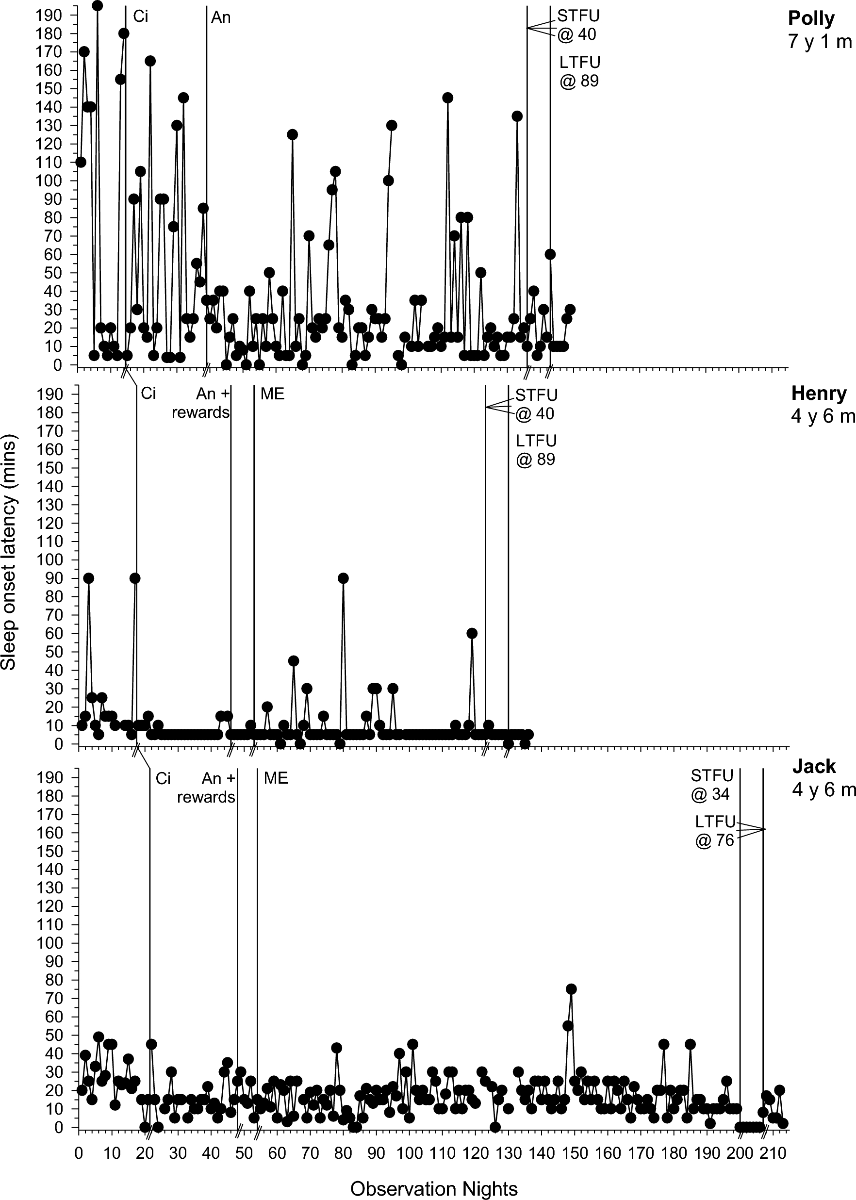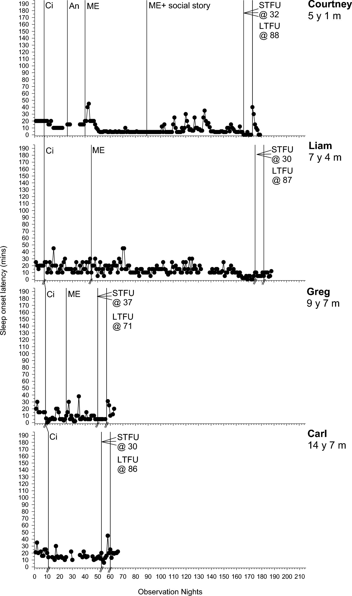 Sleep onset latency (minutes) across participants. An Antecedent modifications, Ci Circadian modifications, ME Modified extinction, STFU short-term follow-up, LTFU long-term follow-up, @ followed by a number represents the number of days follow-up commenced following intervention