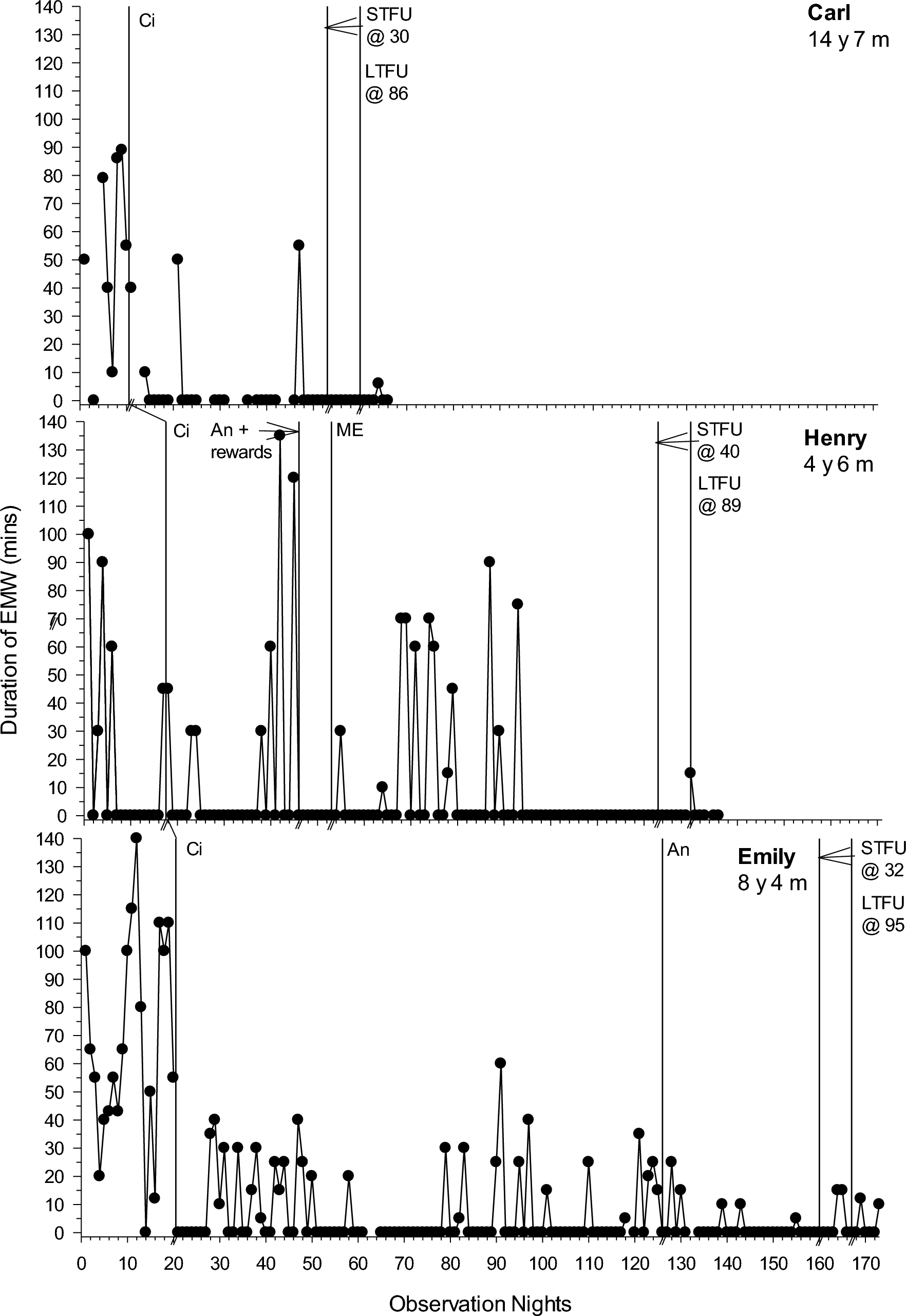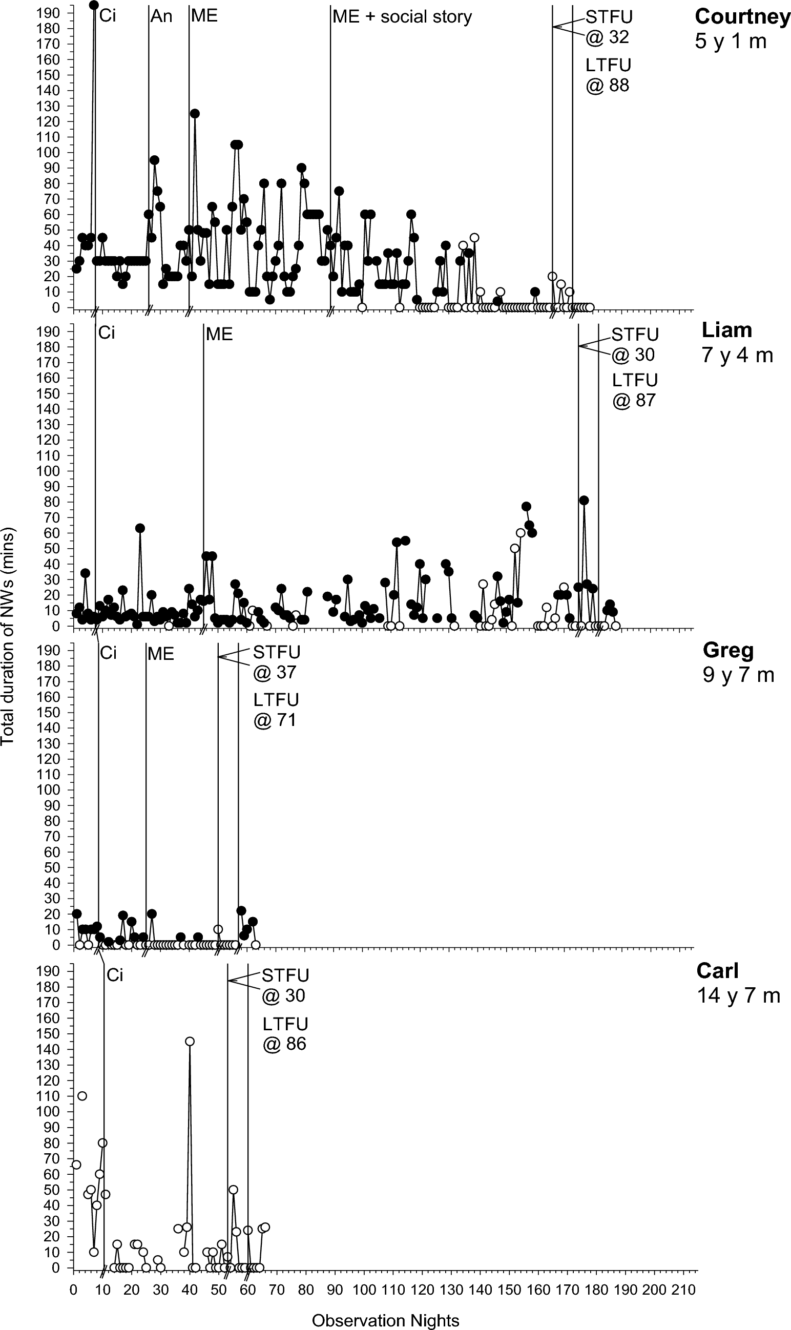 TP-link Tapo C100 night vision Wi-fi cameras with micro-SD cards and written operating instructions were provided to families. Nightly video recordings were primarily used to gather interobserver agreement data (IOA), however, for Carl, it was the primary source of data as his sleep difficulties were not always detectable to his parents and were unable to be accurately recorded in diaries. For Greg, video was used to complete information missing from long-term follow-up (LTFU) sleep diaries. Video of the child’s sleep was coded for a minimum of 20% of nights, across study phases for IOA purposes.