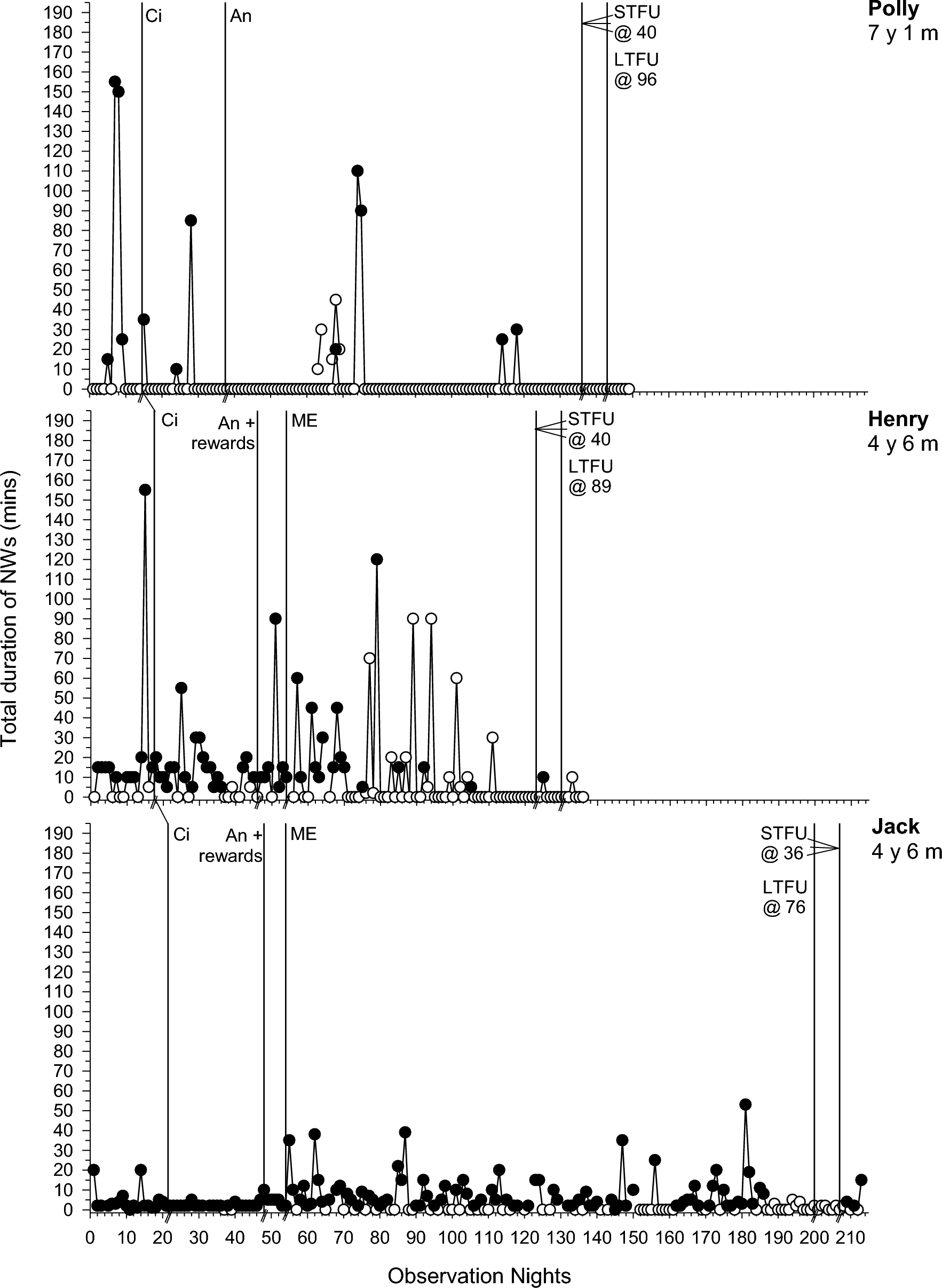 Total duration of night wakings (minutes) across participants. Filled data points = parental presence or involvement; Unfilled data points = no parental presence or involvement. Abbreviations as in Fig. 1