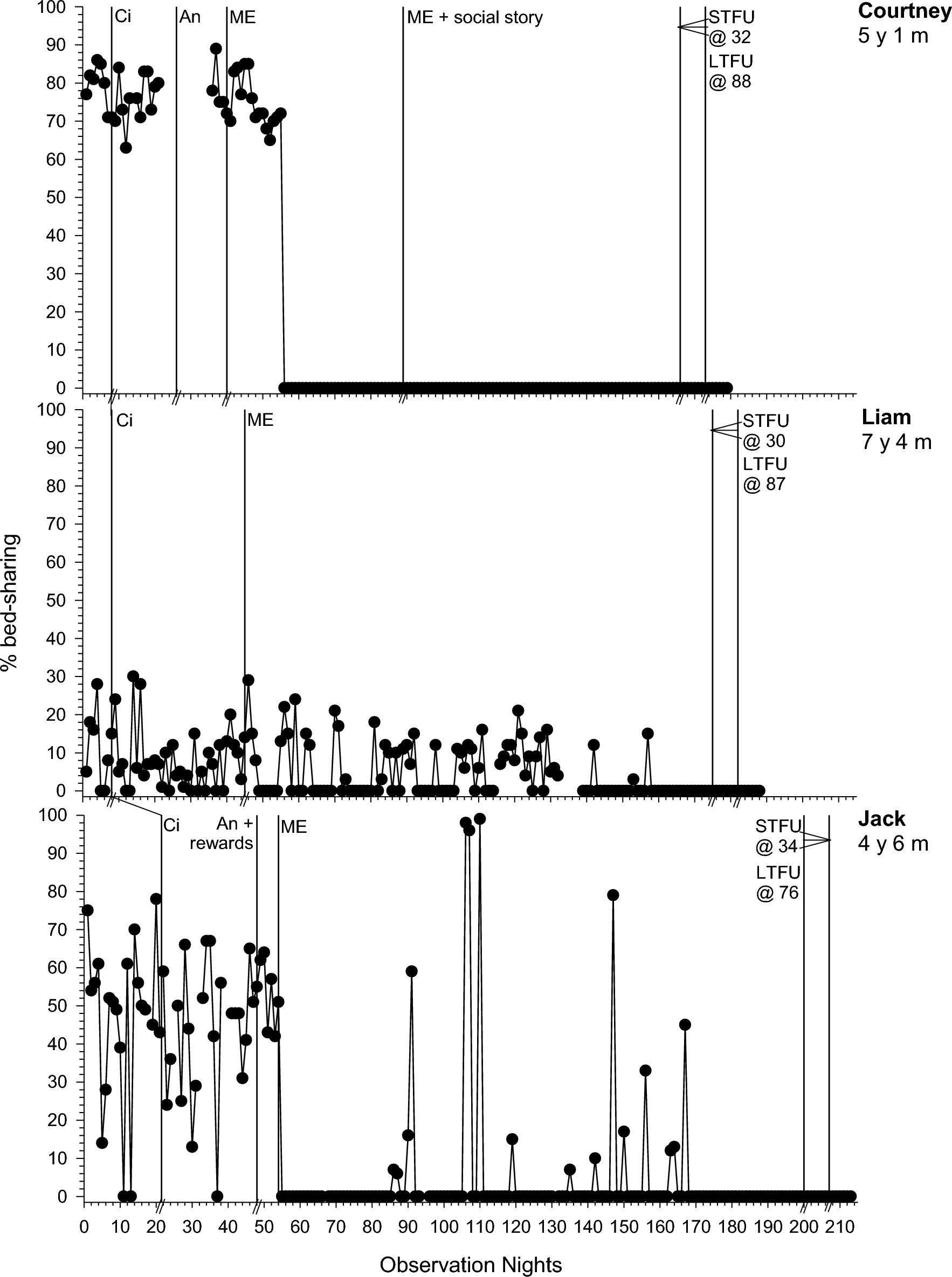 Paper or electronic sleep diaries were completed by parents daily, across study phases. Parents recorded information about their child’s sleep setting; the timing, frequency, and duration (minutes) of daytime naps and NW; SOL (minutes from bedtime to initial sleep onset); frequency of curtain calls (CCs; bids for parent attention before initial sleep onset); time spent bed-sharing (child in parents bed or parents in child’s bed; calculated for visual analysis as a percentage of time spent bed sharing relative to total time in bed); and morning waketime which was used to calculate the duration of early morning waking (EMW; minutes awake prior to the family-set acceptable waketime) for participants for whom it was an intervention target. Parents also recorded information about their child’s sleep-interfering behavior and their response. Key dependent variables were extracted from sleep diary data for visual analysis for all but one participant where video recording was the primary data source (see below).