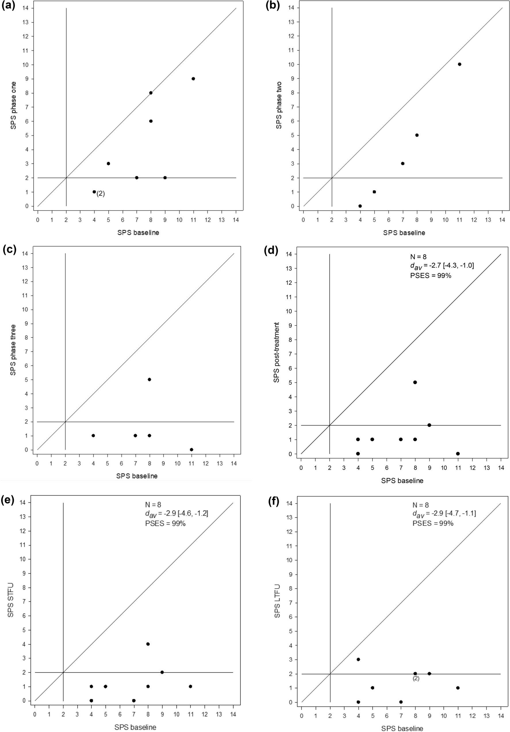 Modified Brinley plots showing participant change in sleep problem severity (SPS) scores from baseline to phases one, two and three, the last phase of intervention, short-term (STFU) and long-term follow-up (LTFU)