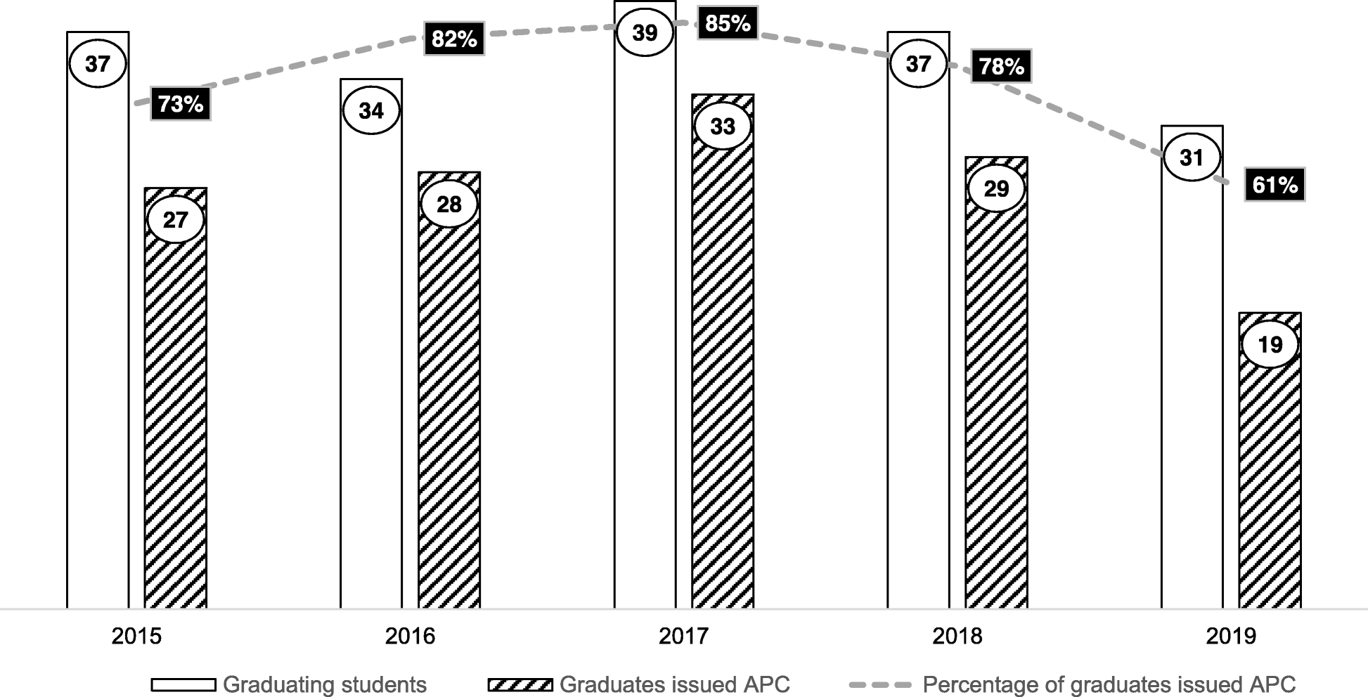 The number of graduating students with the number and percentage of graduates issued an APC in the year following their graduation are presented in Fig. 1. Over the study period there were 178 AUT graduates available to enter the NZ workforce. Between 2015 to 2019, 76% (n = 136) of graduates were issued an APC. The percentage of graduate conversions to APCs ranged from 61 to 85% over the study period, with 2019 recording the lowest number of graduate conversions to APC issue.