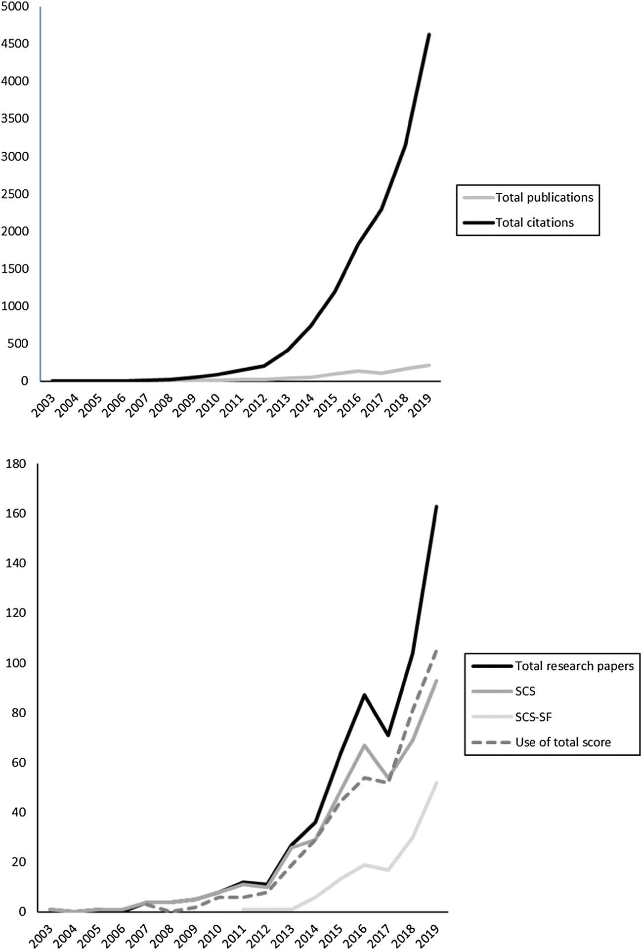 Total number of publications and citations on self-compassion per year (top panel) and number of annual research publications split by the method used to assess this individual difference variable in various studies (bottom panel). SCS Self-Compassion Scale, SCS-SF Self-Compassion Scale-Short Form