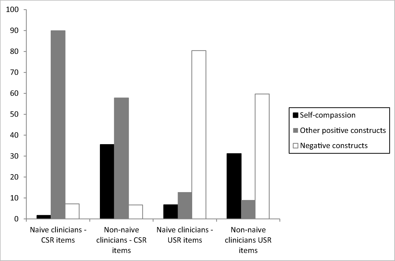 New data on the face validity of the SCS (Corsius 2018): Percentages of naïve and non-naïve clinicians assigning compassionate (CSR) and uncompassionate self-responding (USR) items of the SCS to the categories of self-compassion, other positive features, and negative features. Results showed that compassionate self-responding items were more often classified as positive constructs whereas uncompassionate self-responding items were more frequently identified as negative constructs, and this appeared true for naïve as well as non-naïve clinicians. Further, as expected, the non-naïve clinicians were better in classifying self-compassion items than the naïve clinicians, although it should also be noted that even their scores were not impressive: that is, 35.5% of the compassionate and 31.2% of uncompassionate self-responding items were correctly identified as belonging to the self-compassion construct. SCS Self-Compassion Scale. Naïve clinicians—clinicians who were not familiar with the self-compassion construct, non-naïve clinicians—clinicians who were familiar with the self-compassion construct