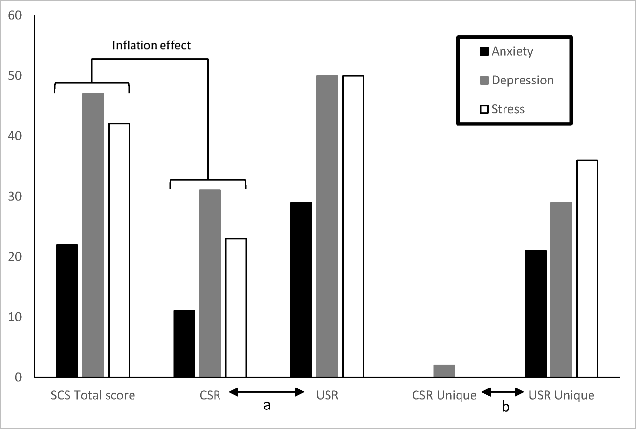 The relation between SCS scores and some key indices of psychopathology expressed in percentages of shared variance. As can be seen, when using the SCS total score, there appears to be a robust relation between self-compassion and symptoms of anxiety, depression, and stress. Note, however, that (a) the shared variance between uncompassionate self-responding (USR) and symptoms is about twice as large as the shared variance between compassionate self-responding (CSR) and symptoms (all comparisons are significant at p < .001) and (b) when controlling for the overlap between USR and CSR, only USR shows a unique link to symptoms. On the basis of these findings, it is hard to evade the conclusion that the incorporation of USR in the SCS inflates the relation between self-compassion and symptoms of psychopathology (Muris et al. 2019b)